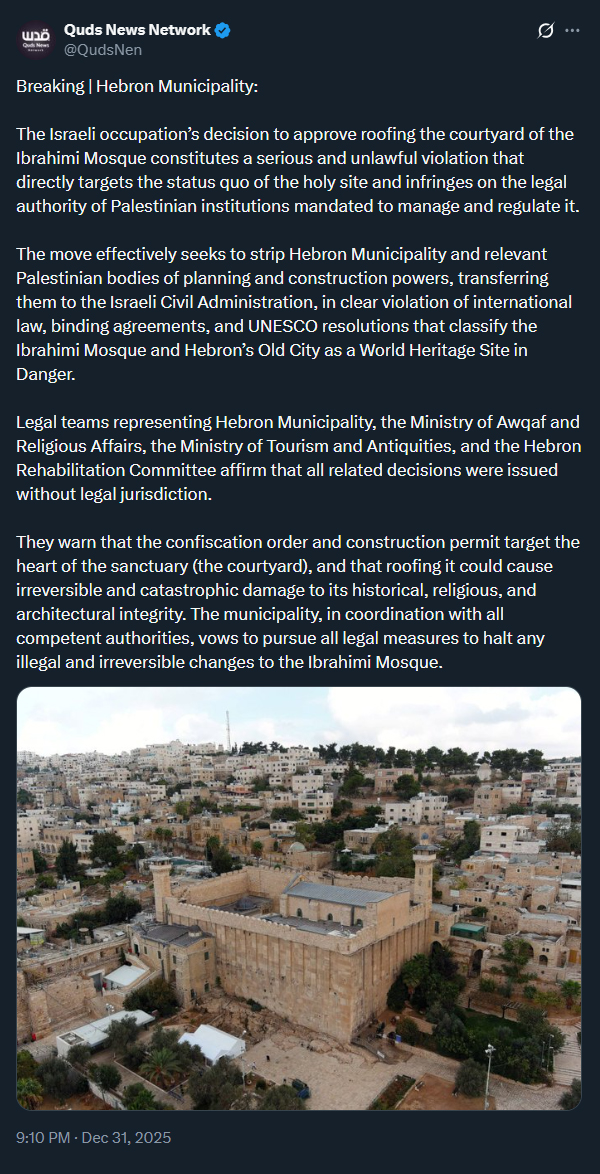 20251231 - Hebron, occupied West Bank - Israeli occupation approves roofing the courtyard of the Ibrahimi Mosque