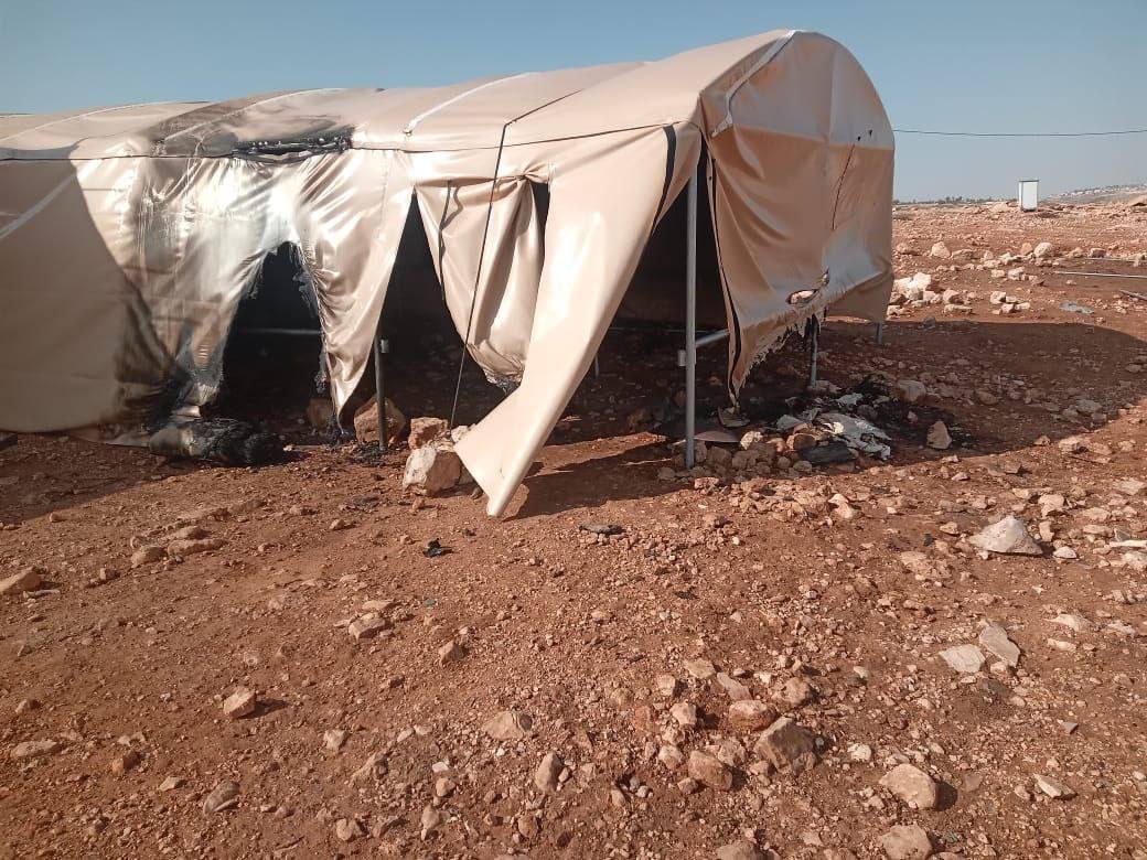 20251118 - north of Hebron, occupied West Bank - Colonizing terrorists tried to burn tent of forced displaced Palestinians in Al-Shuyukh (3 photos)