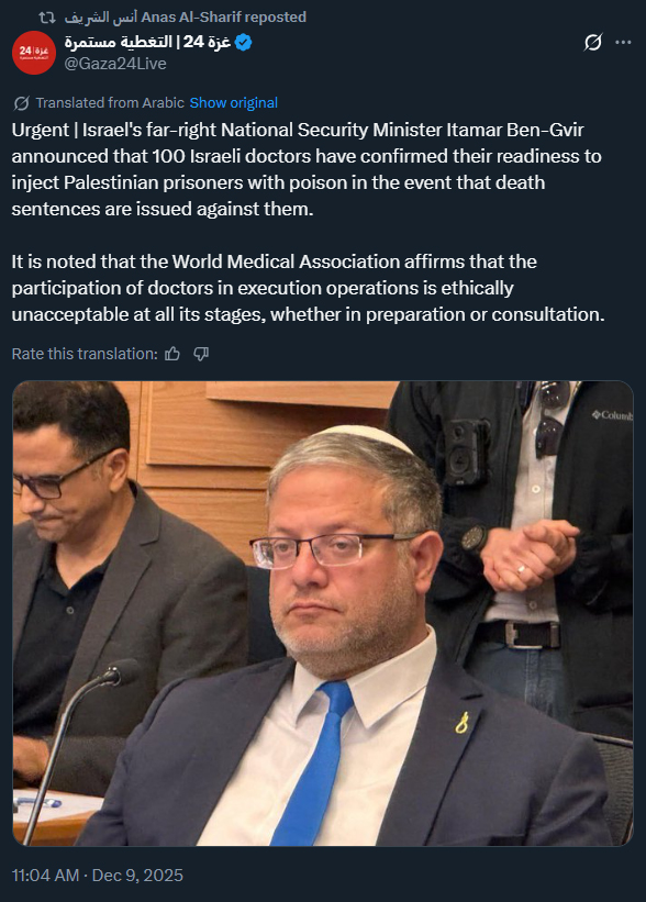 20251209 - X-user reports that 100 Israeli doctors are willing to carry out death penalties.